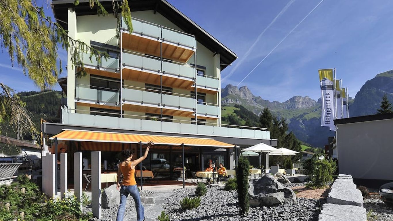Hotel Hahnenblick està situat a Wasserfallstrasse 6, a 0,9 km del centre de Engelberg. Engelberg Abbey és el lloc d'interès més proper a Hotel Hahnenblick.